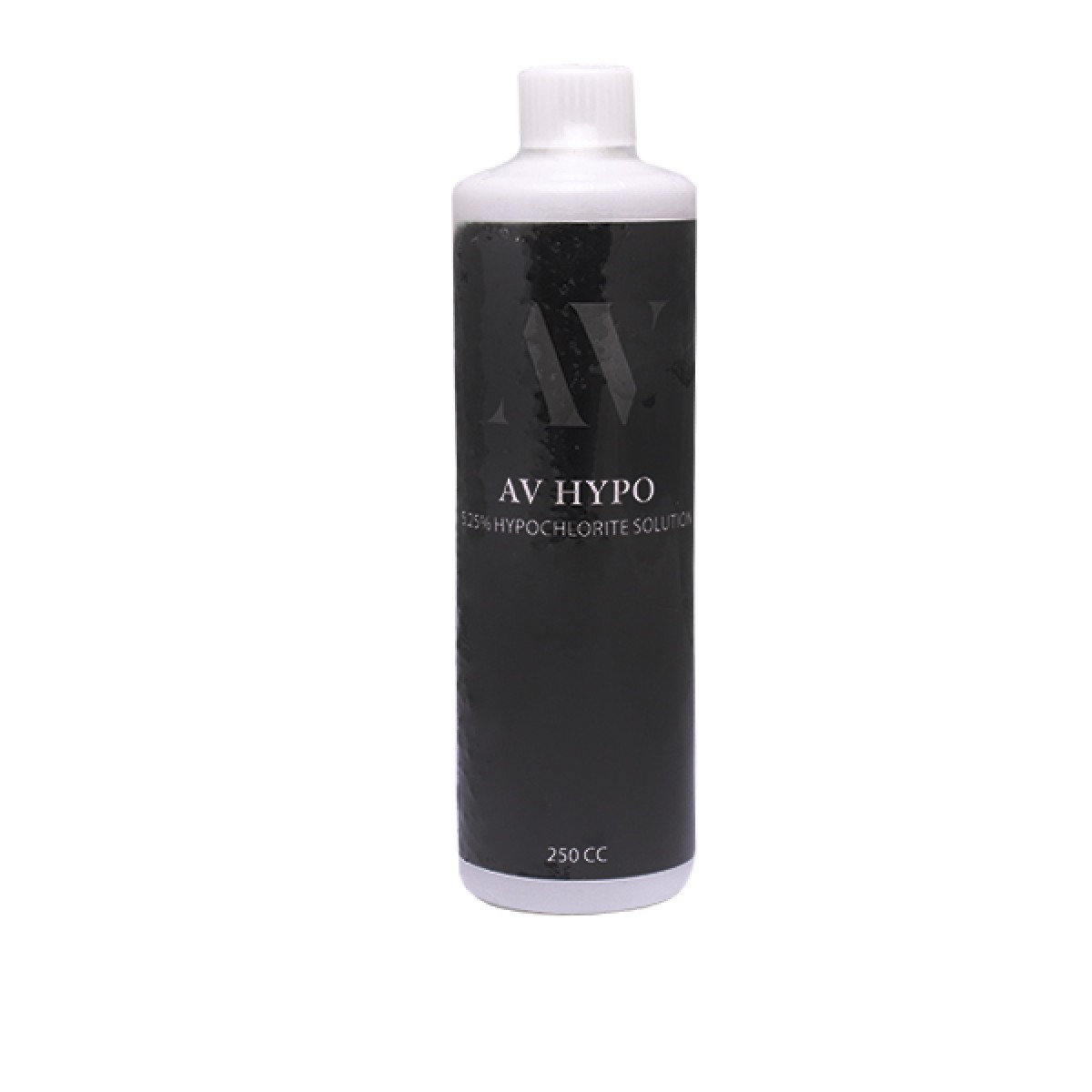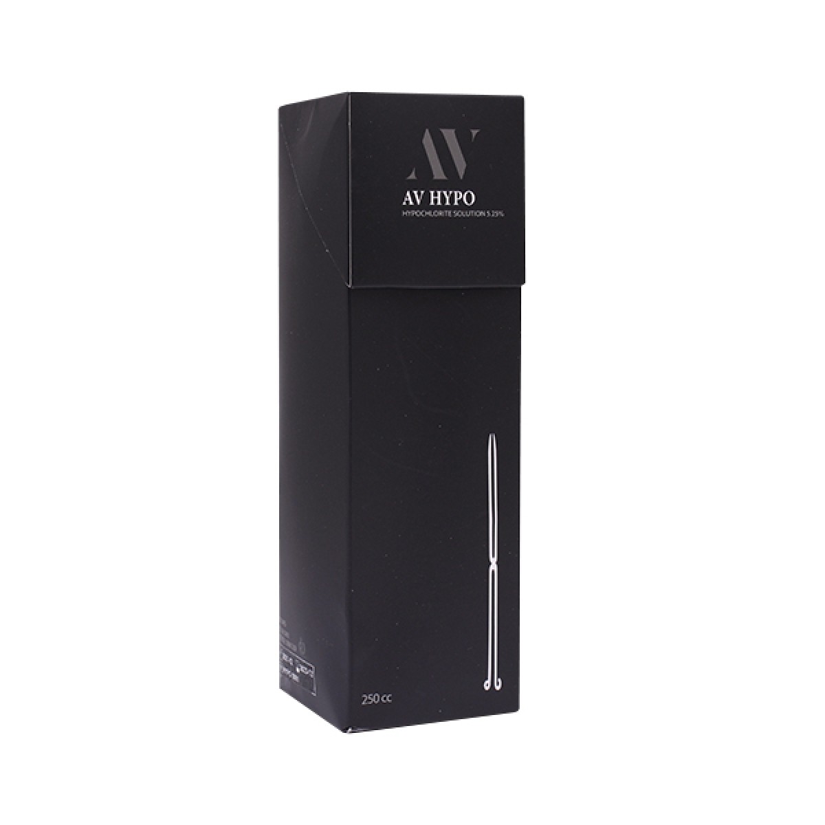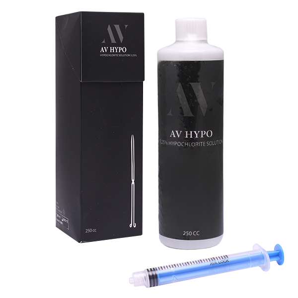 محلول هیپوکلریت سدیم برند AV در بسته های حاوی یک بطری 250 میلی لیتری و یک عدد سرنگ 3 سی سی عرضه می گردد.