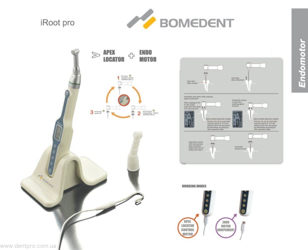 اندو موتور iRoot Pro یک دستگاه پرتابل بسیار پیشرفته جهت آماده سازی کانال در درمان اندو می باشد. این دستگاه را می توان با استفاده از کابل به اپکس فایندر (iRoot Apex) متصل و از عملکرد Auto Reverse آن در زمان افزایش فشار در کانال (بیش از میزان تورک تعیین شده) و هنگام رسیدن به اپکس دندان بهره برد.