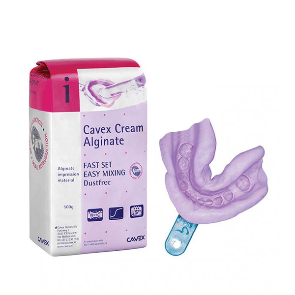 آلژینات خامه‌ای Cavex در وزن 500 گرم عرضه می‌گردد.