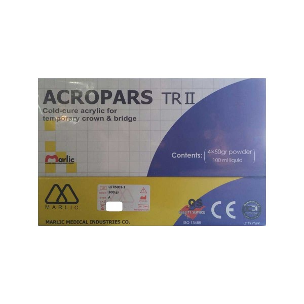 آکریل روکش موقت Marlic Dental  به صورت 100 گرم  پودر  PE و 80 میلی‌لیتر مایع به همراه پیمانه پودر مدرج و قطره چکان مدرج عرضه می‌گردد.